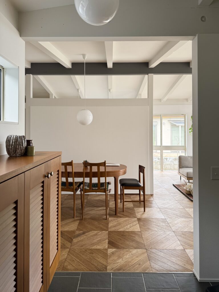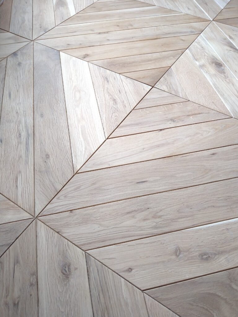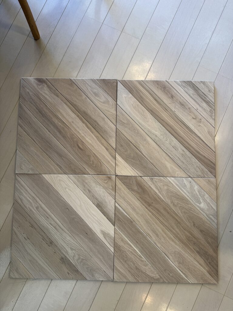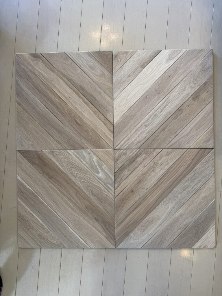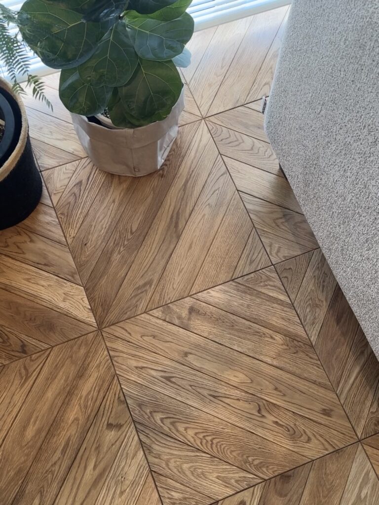 フローリングは無垢オークのオリジナル斜めパーケットフローリング